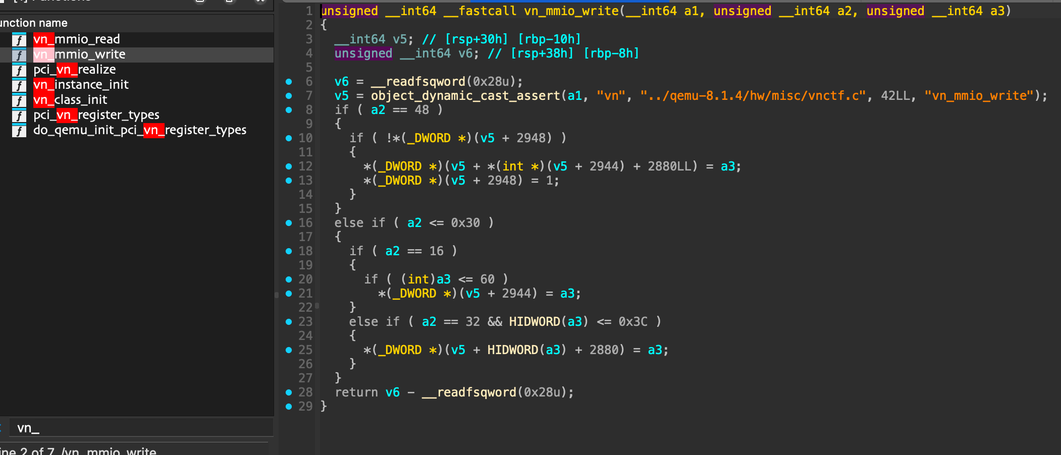 我们关注其中的const MemoryRegionOps *ops,如果能够控制这个结构体地址指向我们控制的地址,就能在执行 vn_mmio_read 和 vn_mmio_write 时去执行 我们地址上 指向的函数。在ida中搜索/bin/sh,查看交叉引用可以找到一个后门函数地址:0x67429B